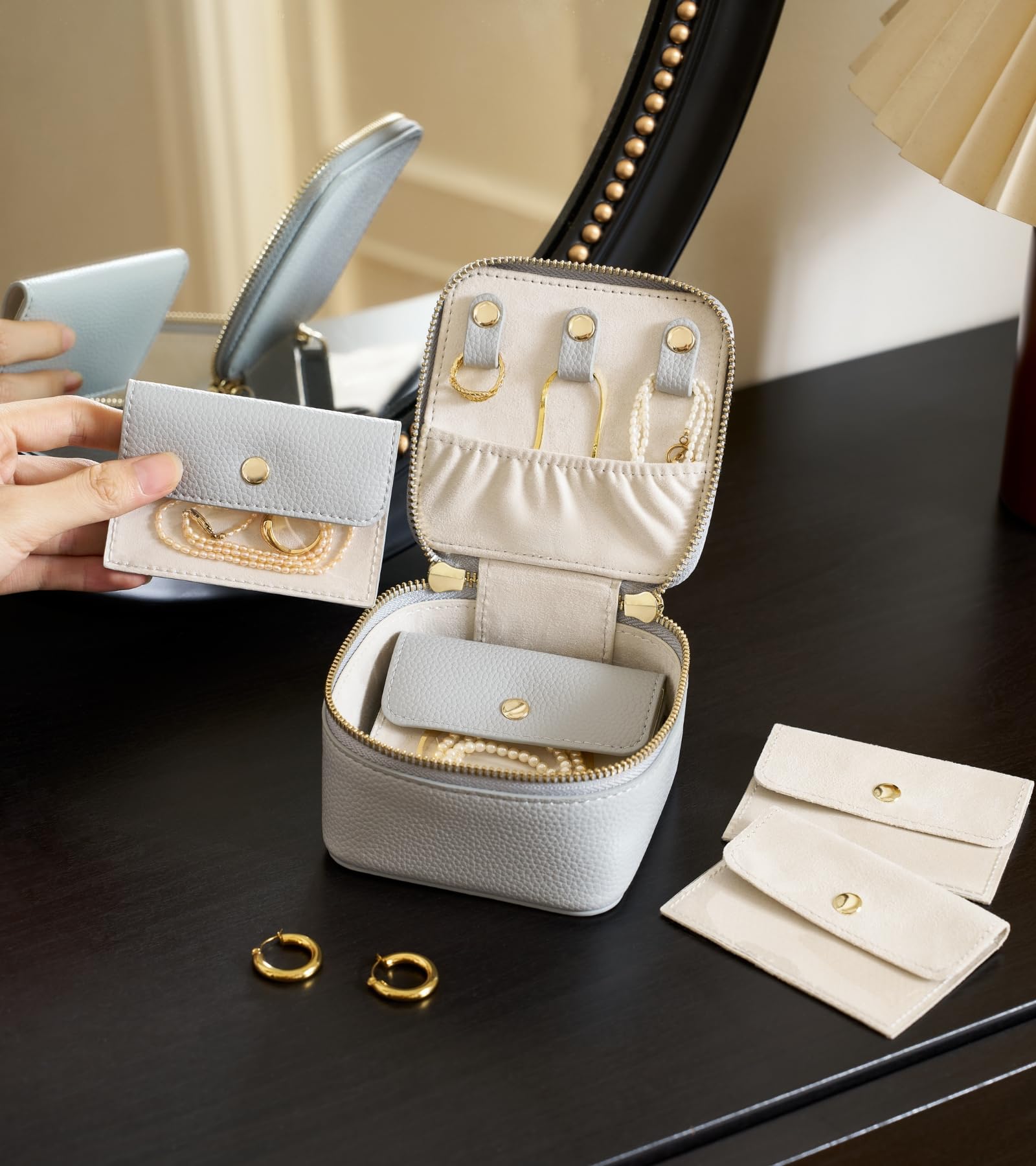 This slim makeup bag is 7.5'' x 2.5'' x 2.1'' (19.1cm x 6.4cm x 5.3cm), ideal for storing makeup brushes and daily mini essentials like lip balms, hair ties, jewelry, Air Pods, charging cords, and medications.