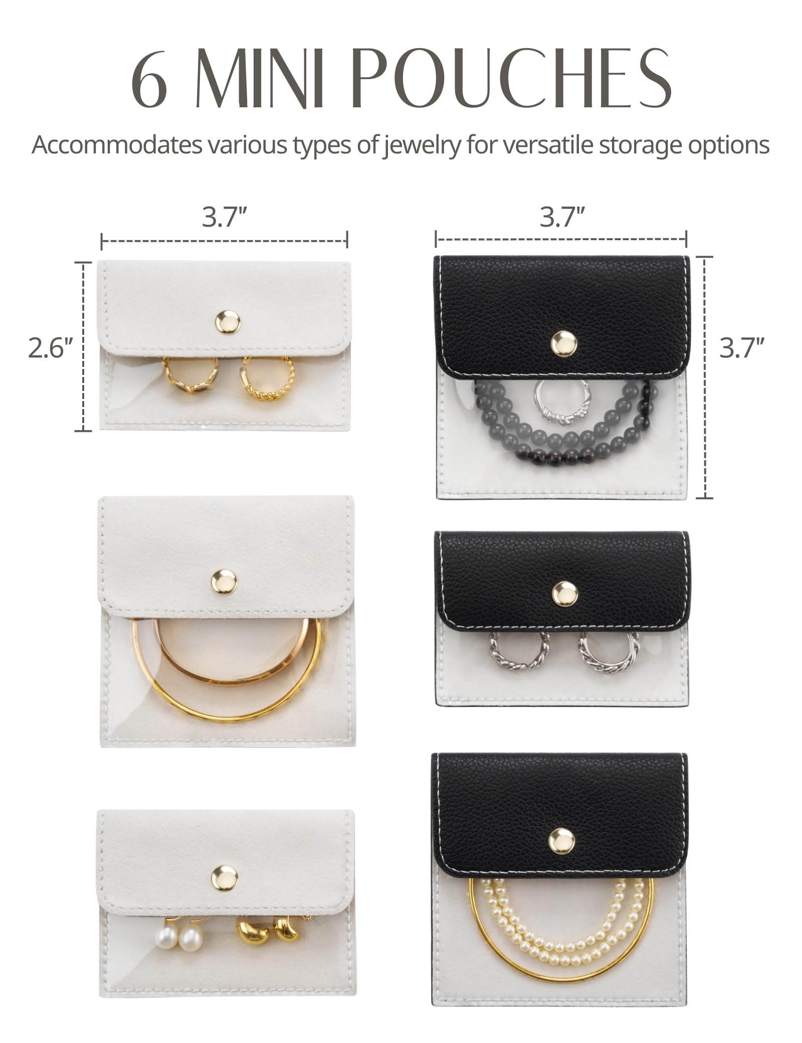 - Six Clear TPU Pouches: These transparent mini pouches are designed to offer convenient visibility and easy access to your jewelry collection. Whether used individually on-the-go or neatly stored inside the jewelry box at home, these pouches provide a versatile solution for organizing and safeguarding your precious pieces.