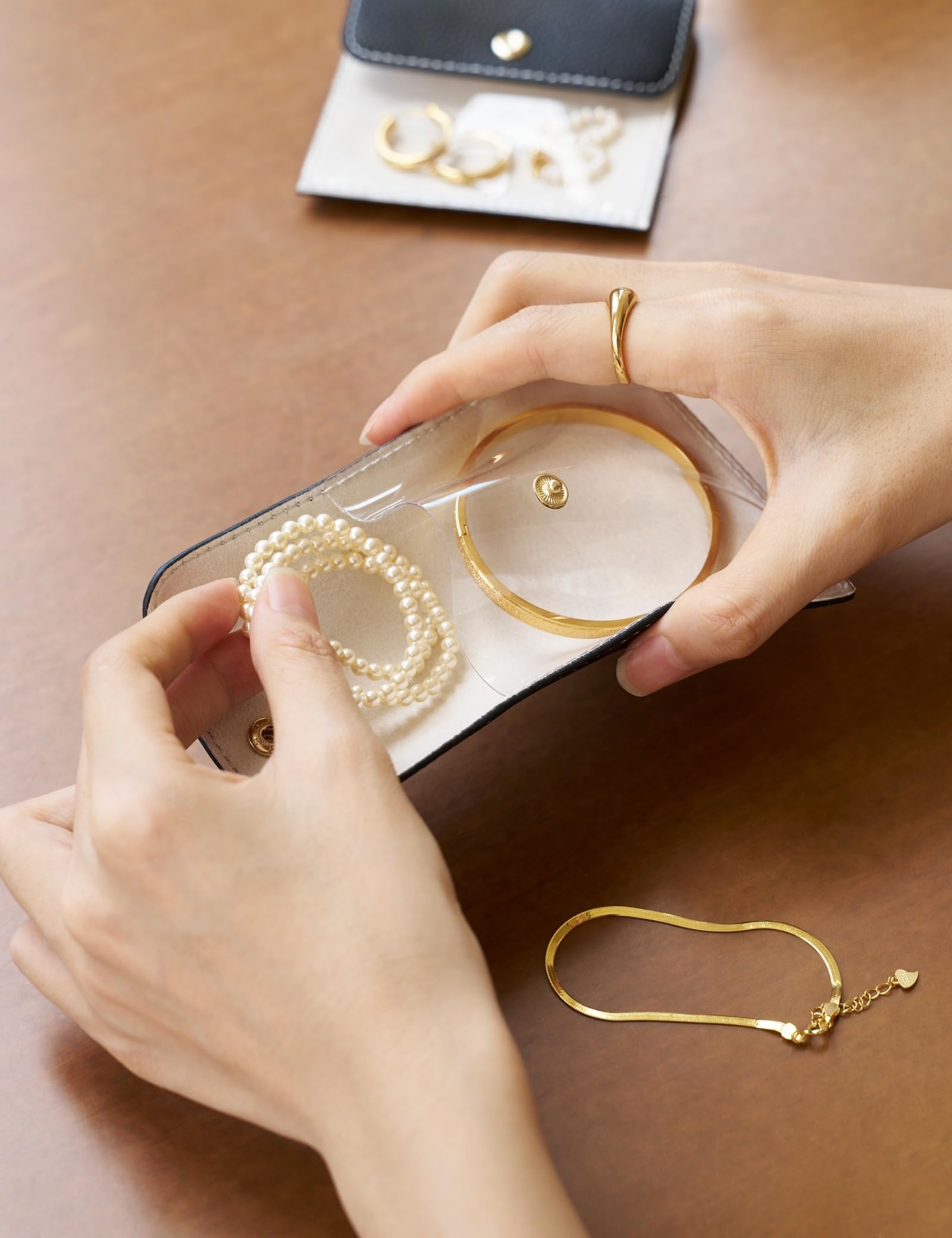 - This portable travel jewelry case set includes an exquisite jewelry box and six clear mini jewelry pouches. The top lid panel features three snaps designed to prevent delicate necklaces or bracelets from tangling.