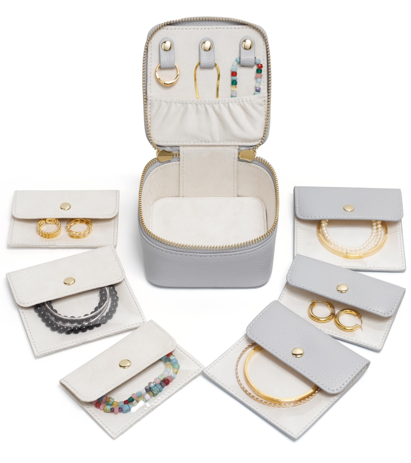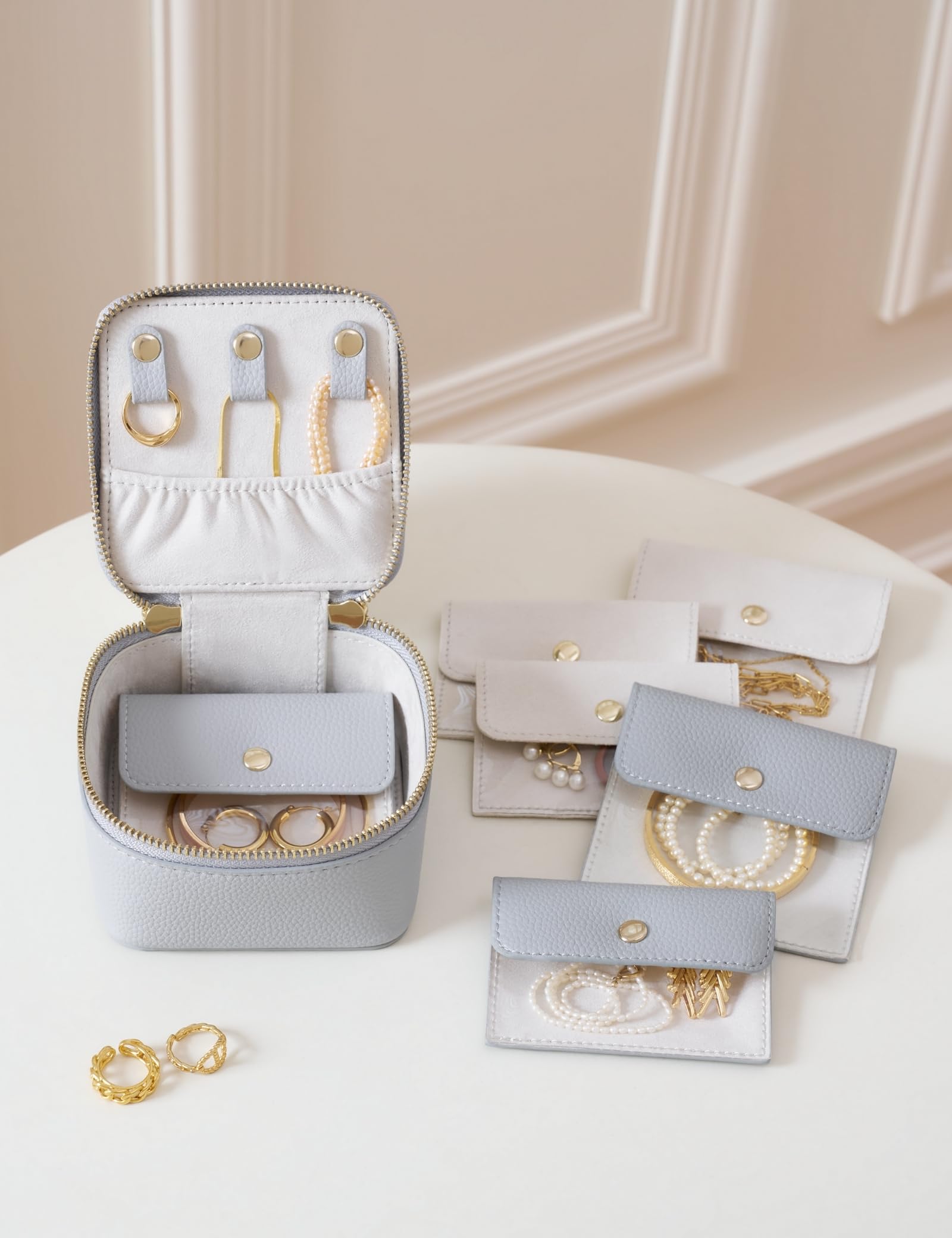 - This portable travel jewelry case set includes an exquisite jewelry box and six clear mini jewelry pouches. The top lid panel features three snaps designed to prevent delicate necklaces or bracelets from tangling.