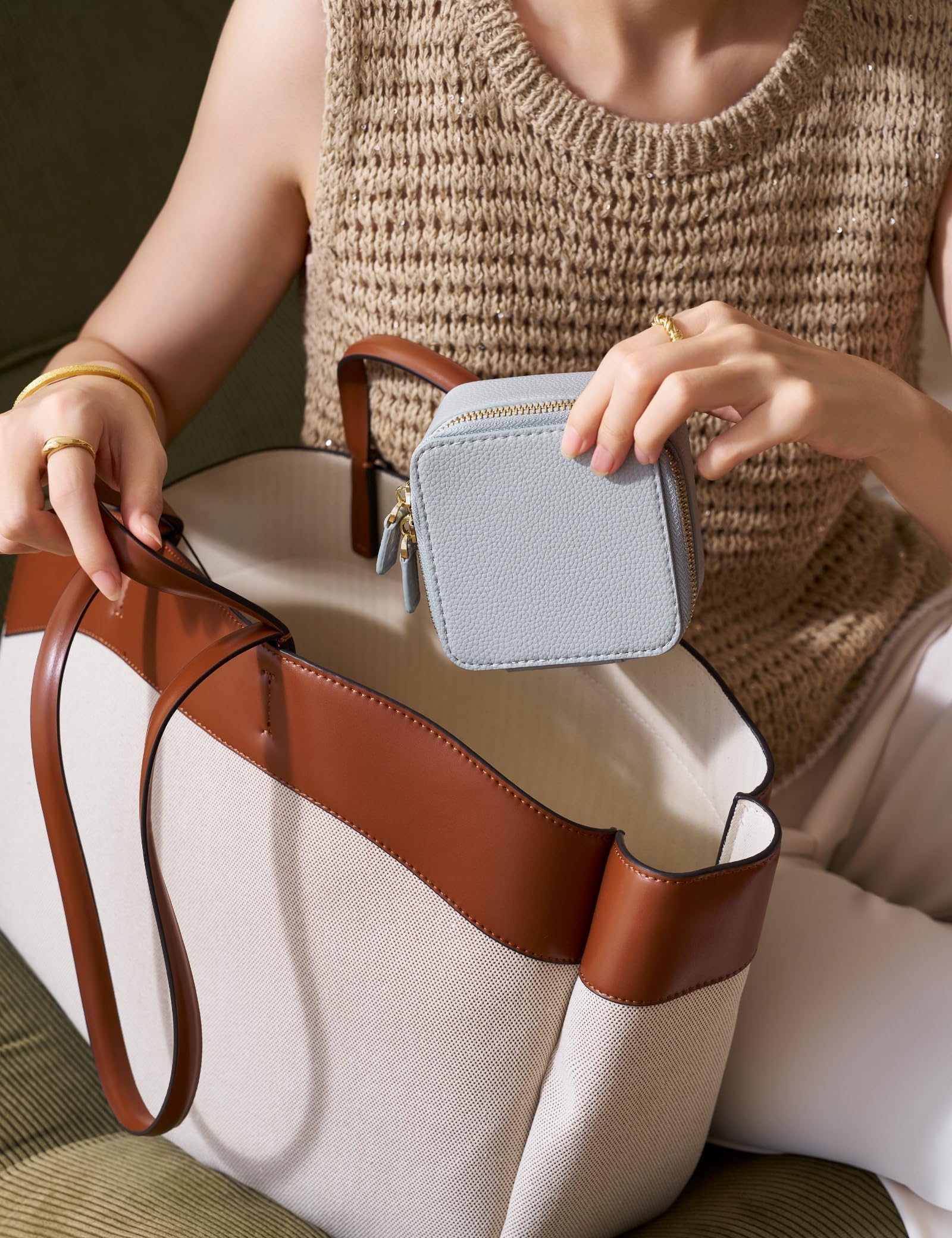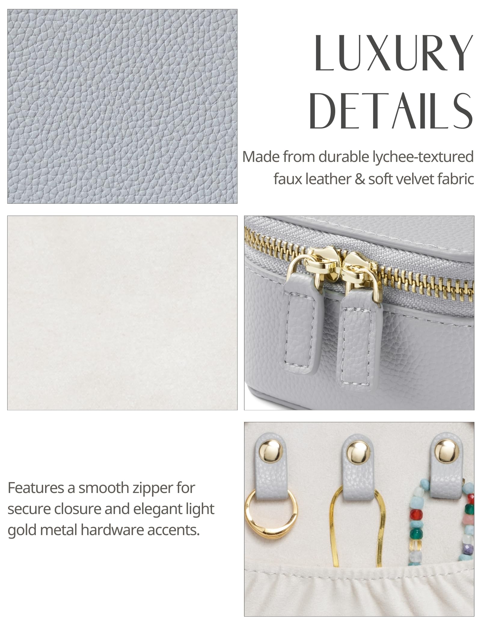 - Made from durable lychee-textured faux leather, the small jewelry box features a smooth zipper for secure closure and elegant light gold metal hardware accents, adding a touch of luxury and sophistication to the design.