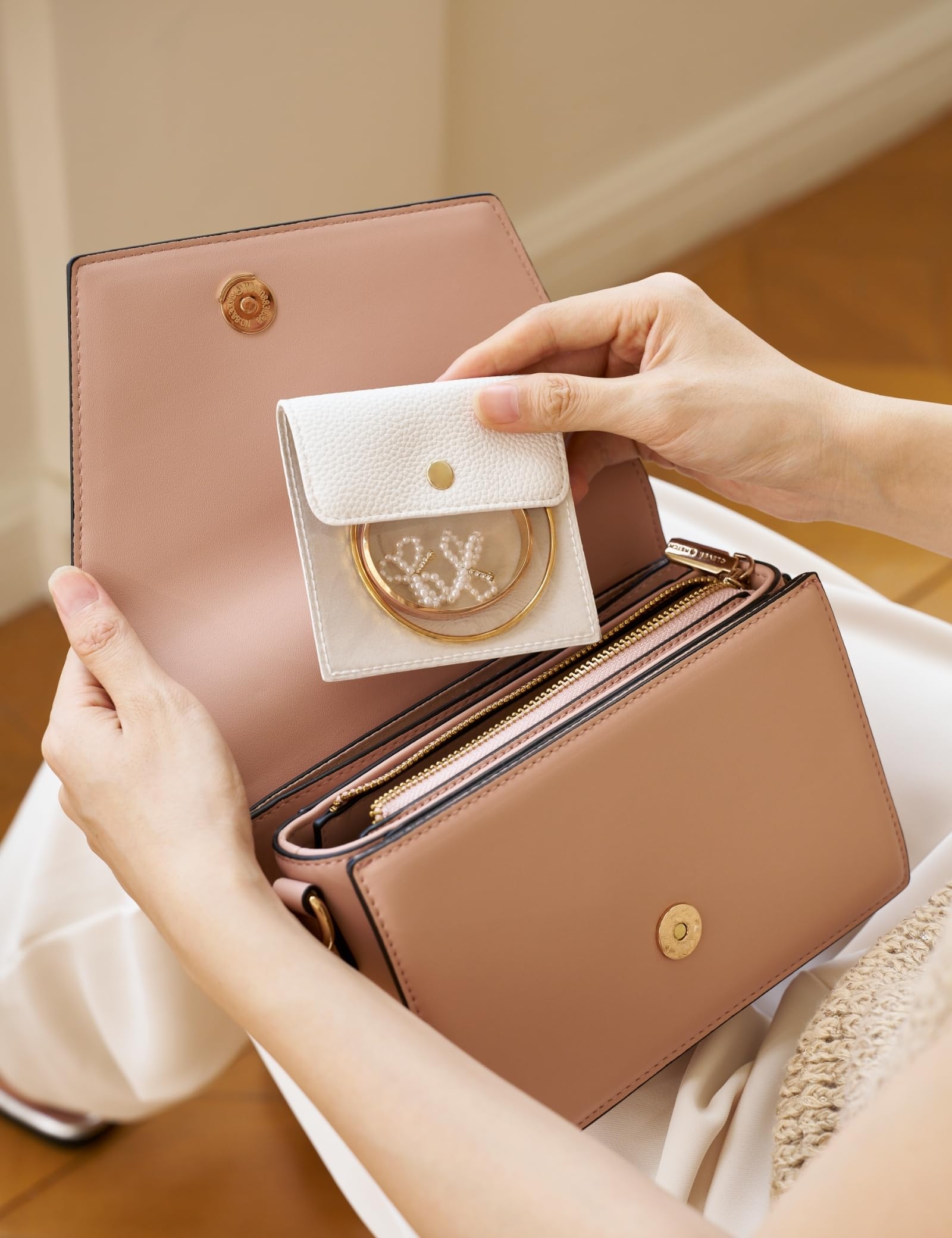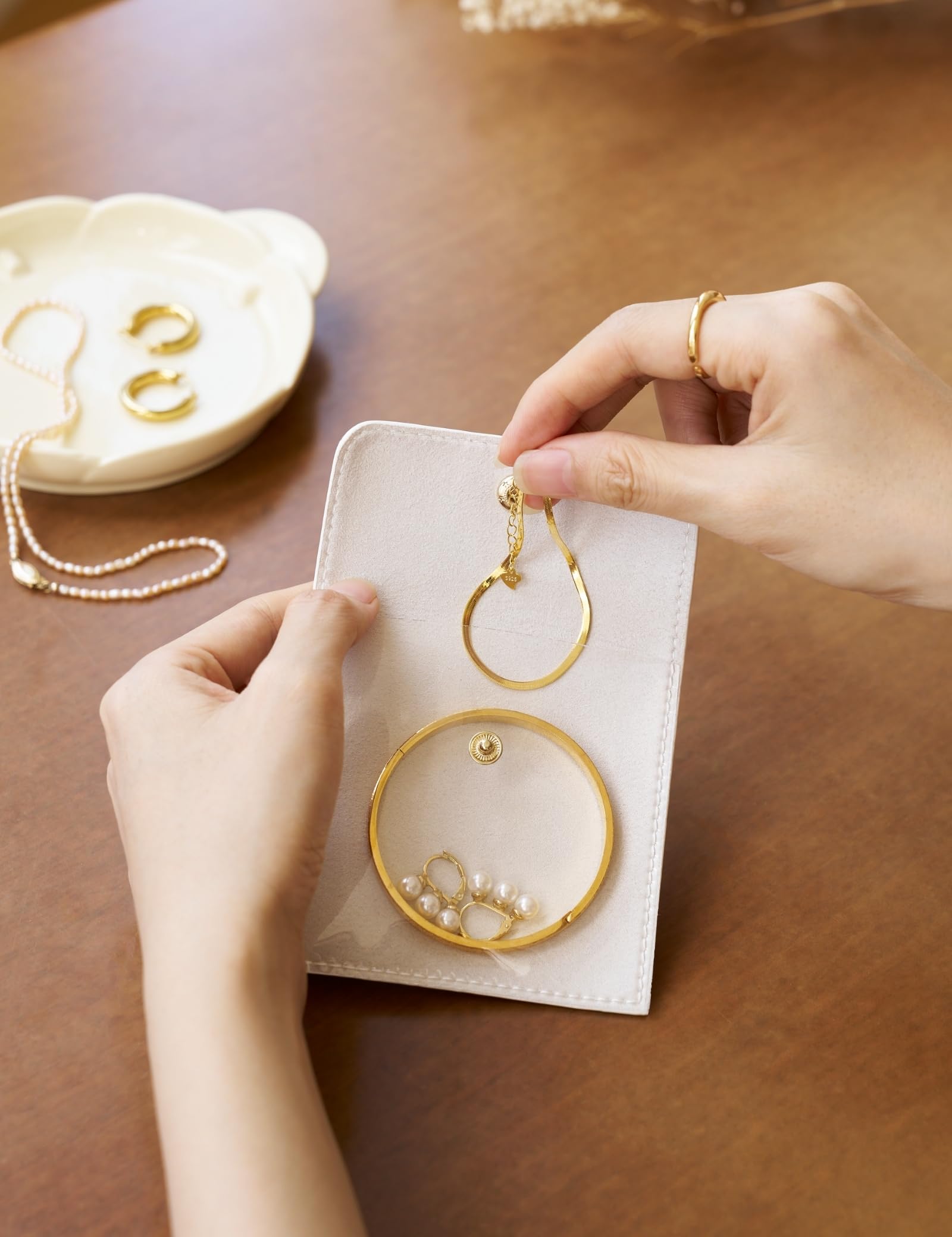 - This portable travel jewelry case set includes an exquisite jewelry box and six clear mini jewelry pouches. The top lid panel features three snaps designed to prevent delicate necklaces or bracelets from tangling.