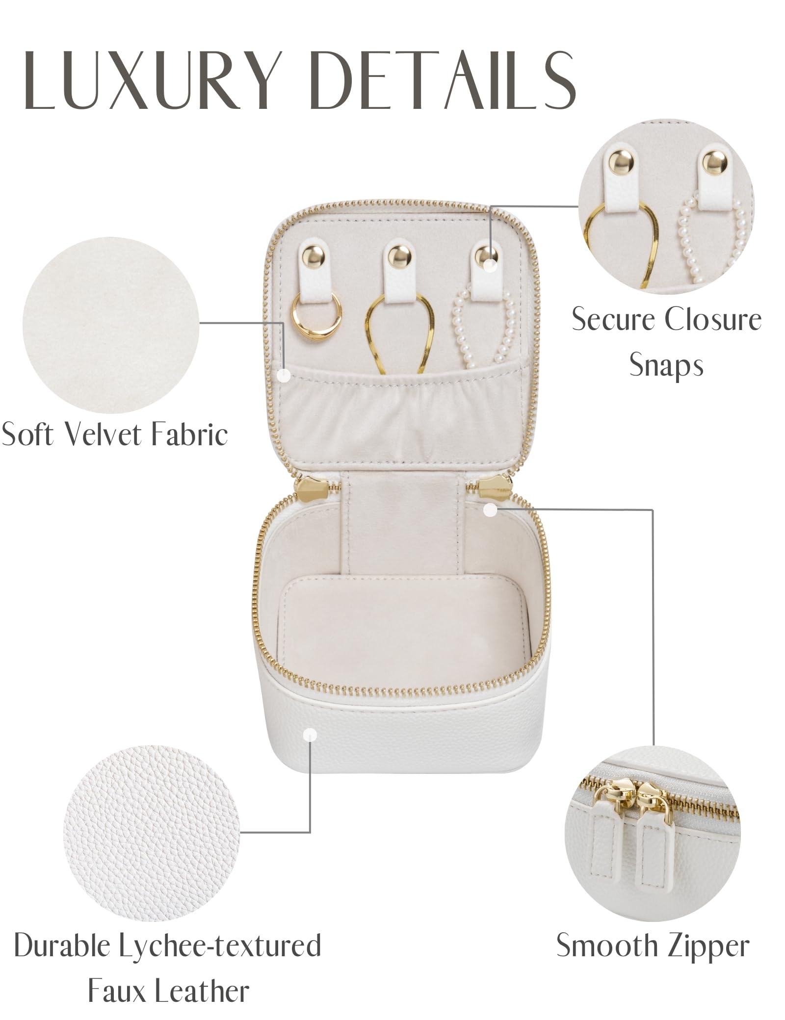 - Made from durable lychee-textured faux leather, the small jewelry box features a smooth zipper for secure closure and elegant light gold metal hardware accents, adding a touch of luxury and sophistication to the design.
